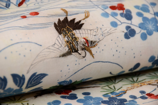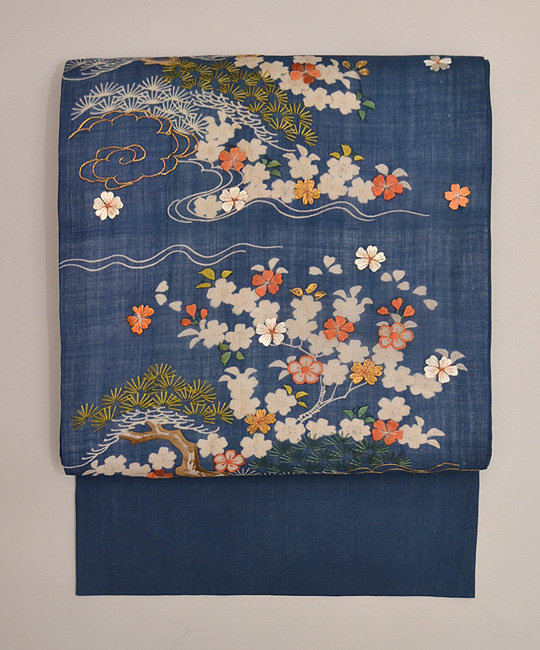 白揚げの可憐な桜に松と、シンプルな中に、朱と緑の刺繍が絶妙なバランスを保ち輝いています。