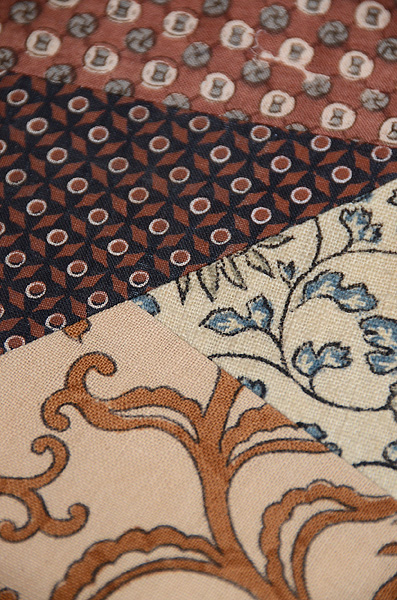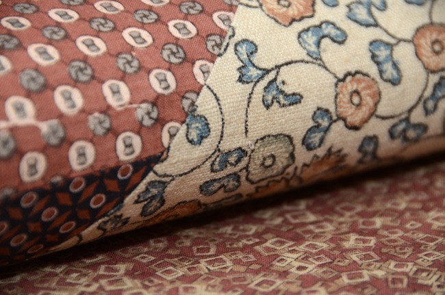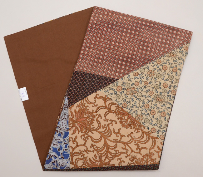 渋いけれどもやさしい色調の和更紗を合わせて型紙に取り、名古屋帯にしました。