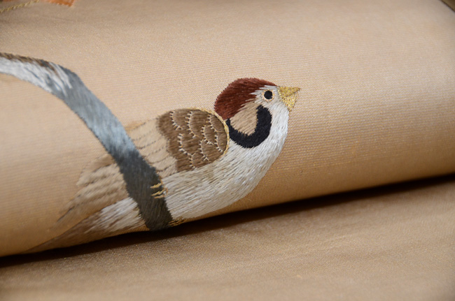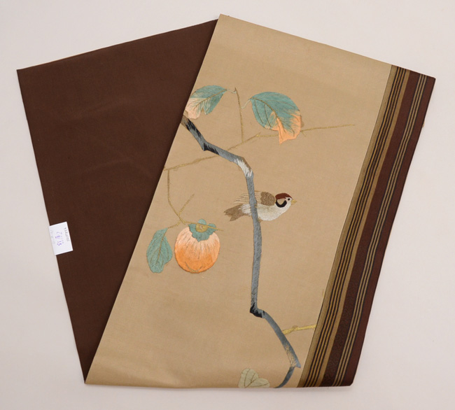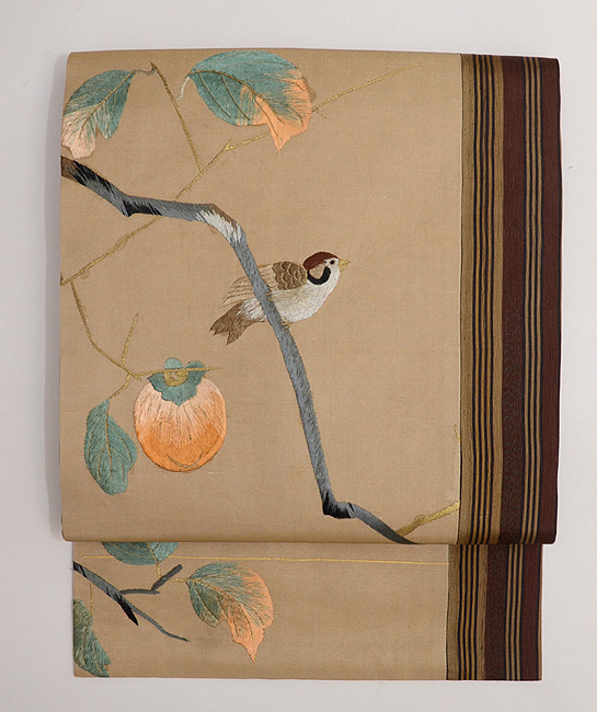 柿枝に雀、ボーダーの名古屋帯