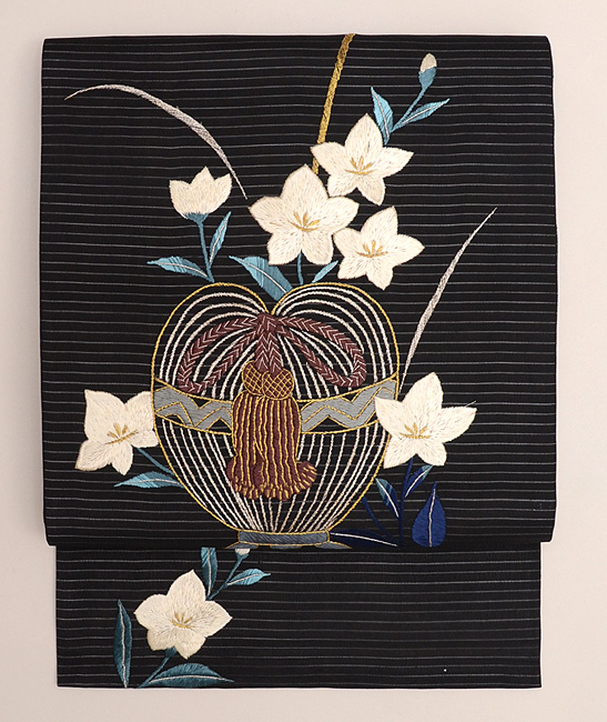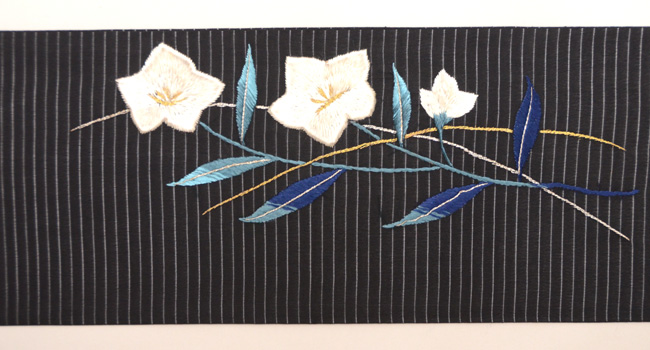 まあるい虫かごの刺繍がシャープで、白い桔梗との取り合わせも美しい名古屋帯です。