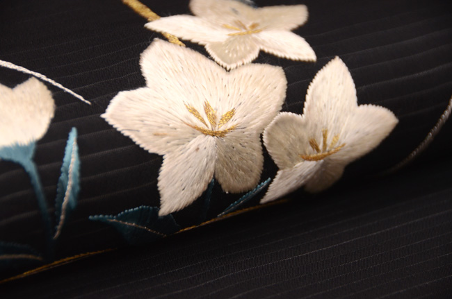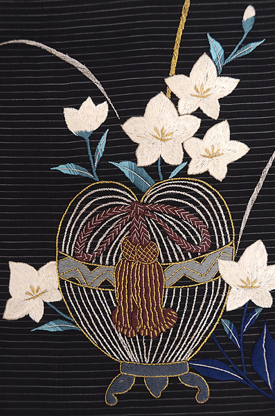 多くのお着物への対応を考えて、紗を墨色に染めて刺繍しました。