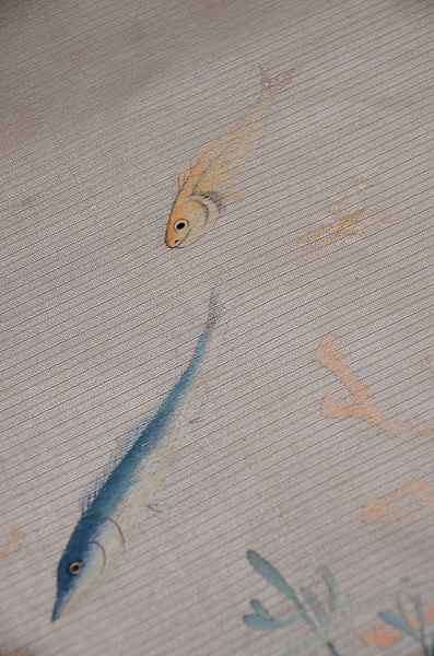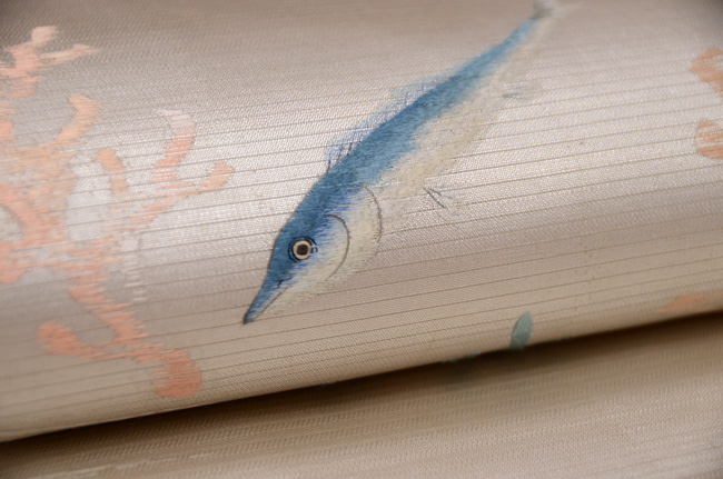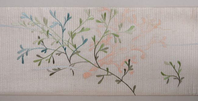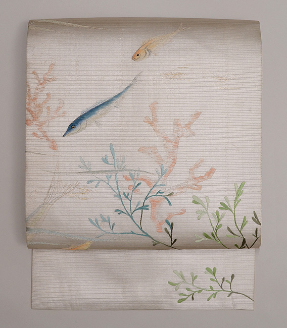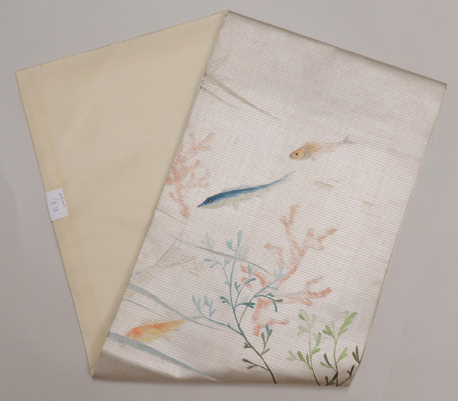 光り輝く海の中、海藻ゆらめき、魚が踊る様が刺繍で表現された、幻想的な美しい帯です。