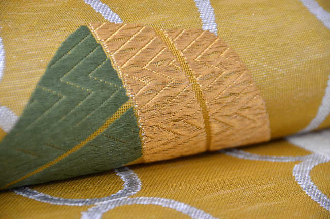 縦に金糸を使い、緯に捩り織りの隙間から浮き織りの銀糸が光って、豪華な夏帯です。