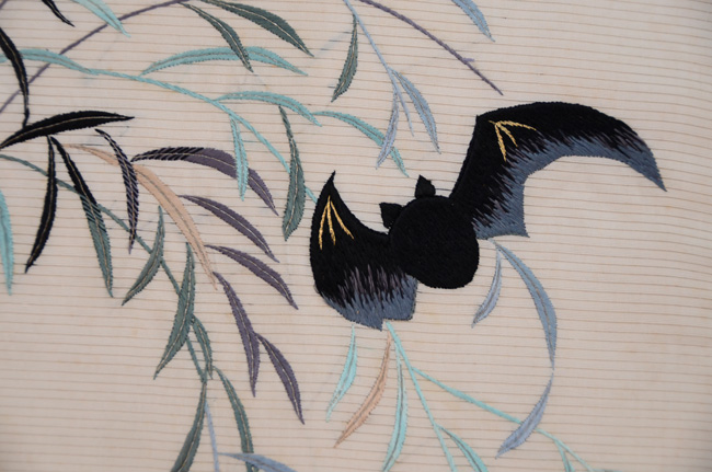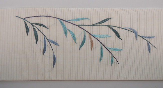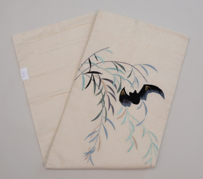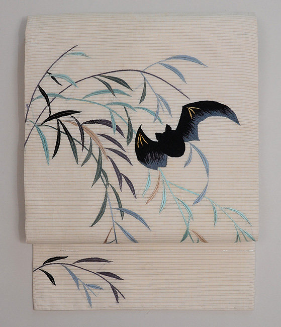 柳にコウモリ絽の刺繍名古屋帯