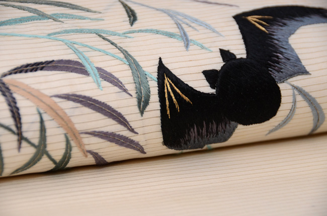 ゆったりと優美な肢体を見せて、仲良く舞っている雁たちの刺繍帯です。