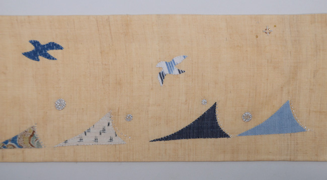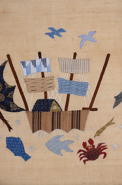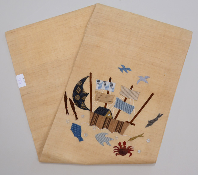 ヨットを取り巻く海と空の仲間たちが、古布と縫いでコラージュされた、楽しい夏帯です。