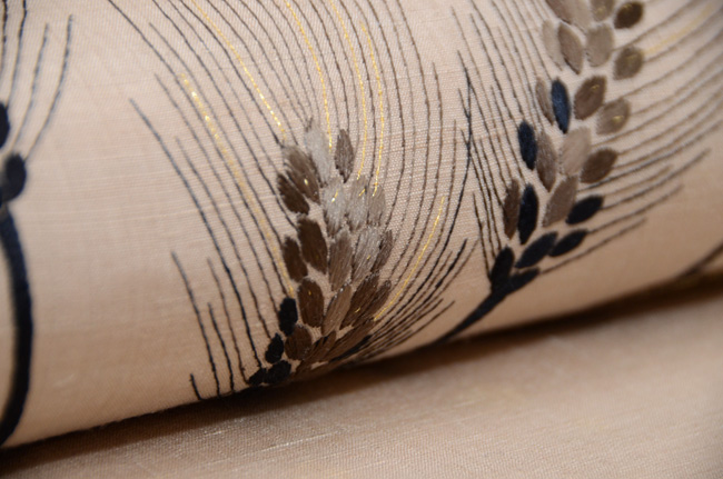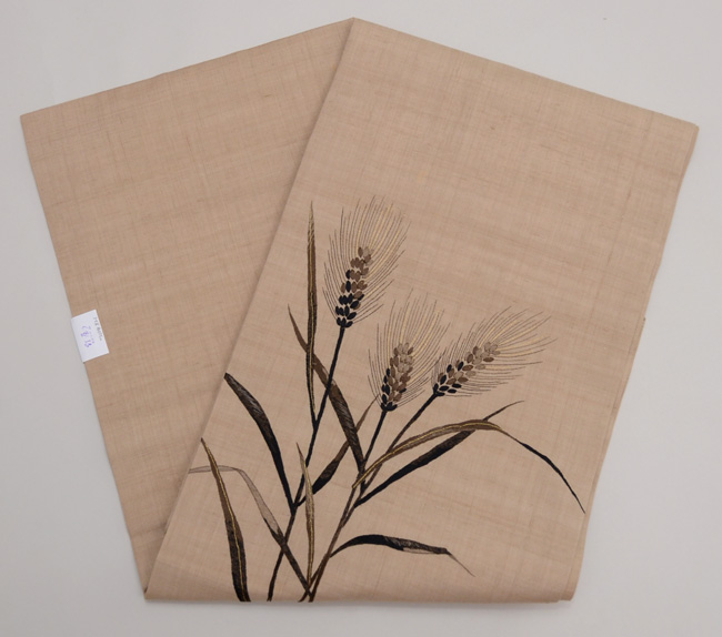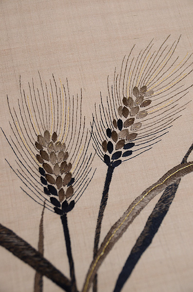 ベージュの紬地に、大きな麦の柄を、同色濃淡の糸で刺繍してみました。