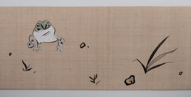 前には、カエルが鳴いています。モノトーンのお着物に添わせてみたいですね。