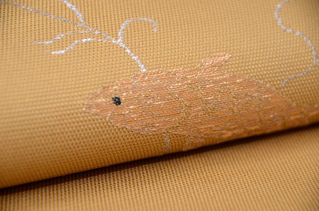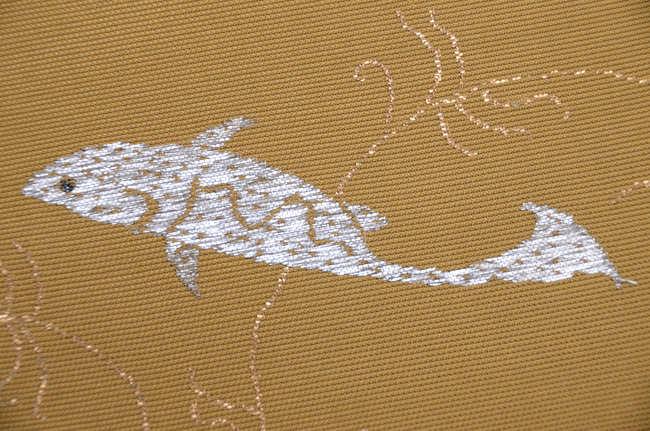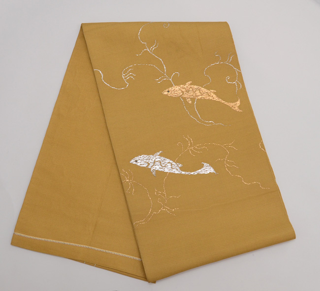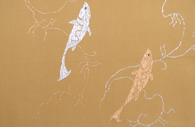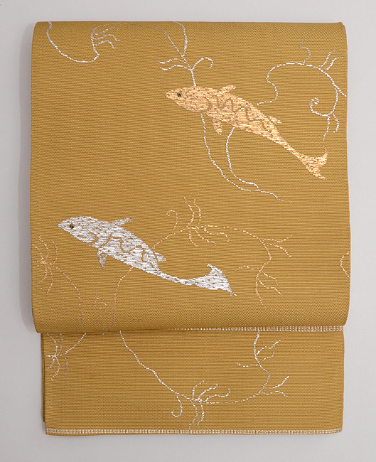 龍村の金茶地に、龍村の赤金と銀とで、若鮎が織り込まれています。