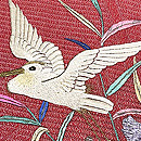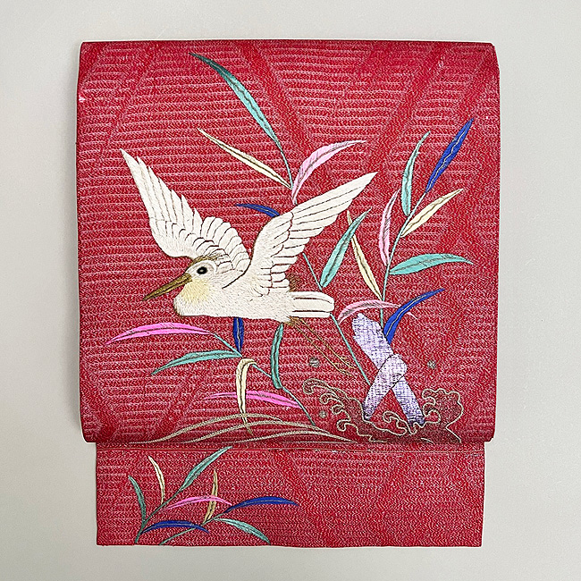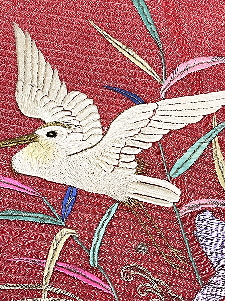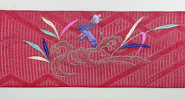 下に紅が隠れているような趣ある墨色で波を織り出して、海上高くカモメを刺繍で配しています。