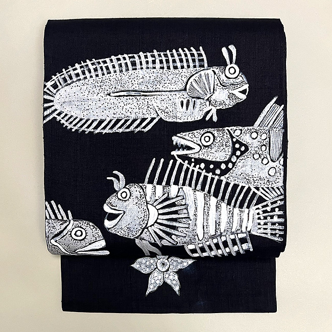 平織りの上にゆらゆらした緯糸の波を重ねて透け感溢れるゆらめきが魅力的な軽い夏帯です。