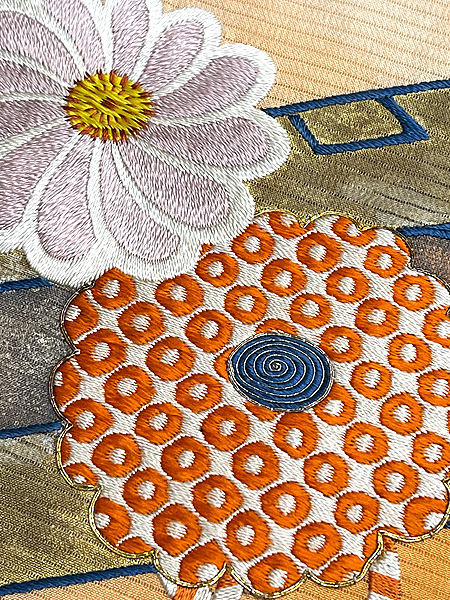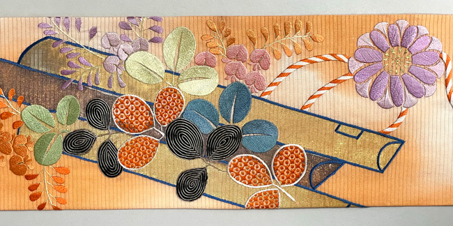 金、銀通しの滝縞の中に、絣で、柳とつばめが織り込まれています。