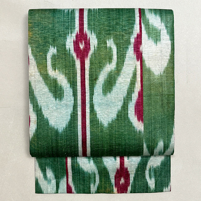 カーキ色が珍しい菊唐草の型染めの帯は、手触りの優しい麻で夏着物にすっきりと重宝です。
