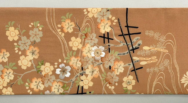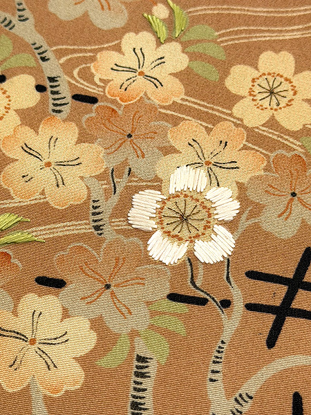 綴れ地鳥の子色蘭菊に梅文刺繍名古屋帯
