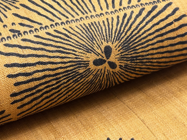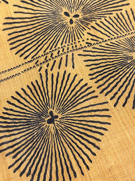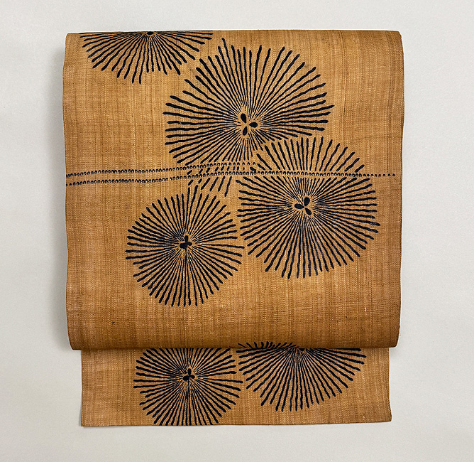 ほっこり温かみのある山吹色に穏やかな風景画をおいたような心和む紅型の帯です。