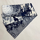 一越縮緬地に江戸裂がコラージュされた、重厚な中に何かユーモアの溢れたかわいい名古屋帯です。