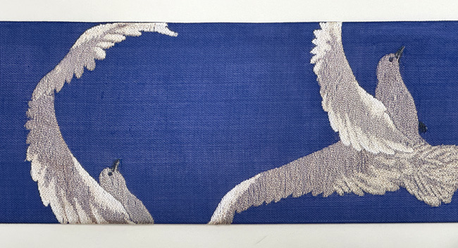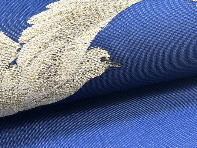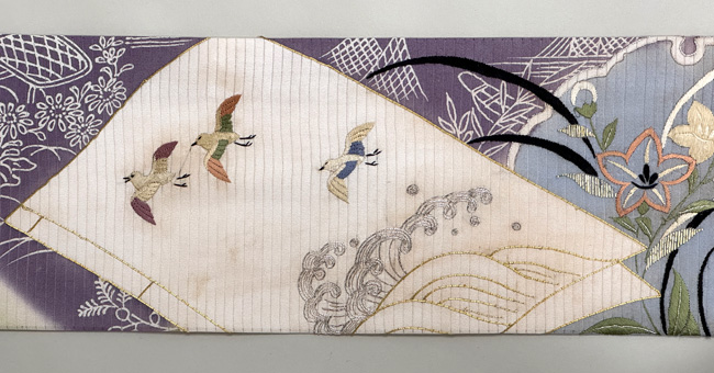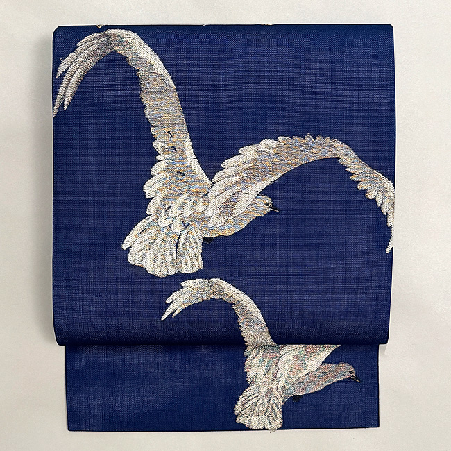 流れるような曲線に遊ぶ千鳥たちがかわいい名古屋帯です。