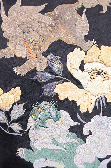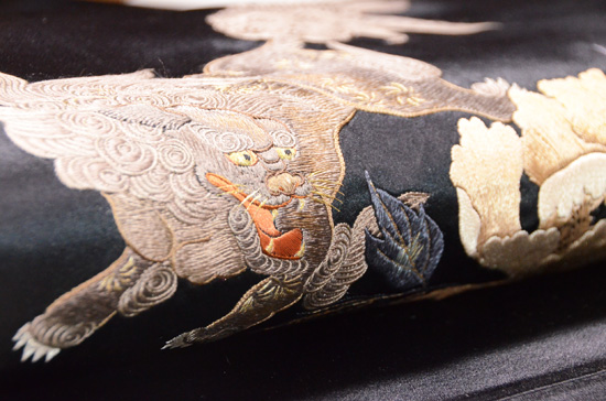 くるくると巻いたたたてがみ、横に張った鼻と大きく開いた口の勇ましいモチーフ獅子ですが、品の良い色合いと甘撚の糸で施されている刺繍は、とてもやさしいニュアンス。