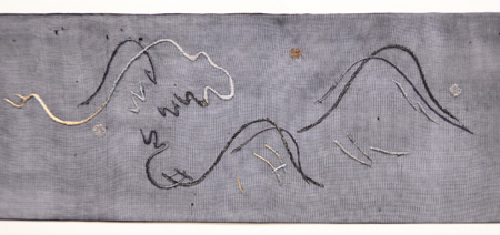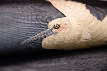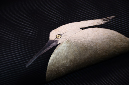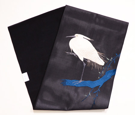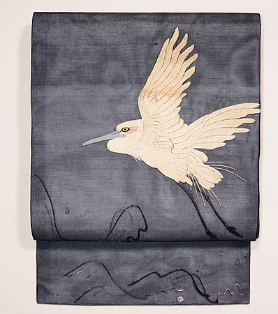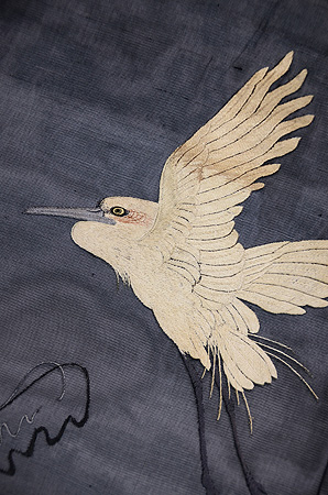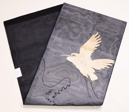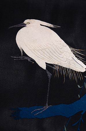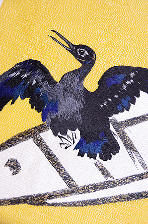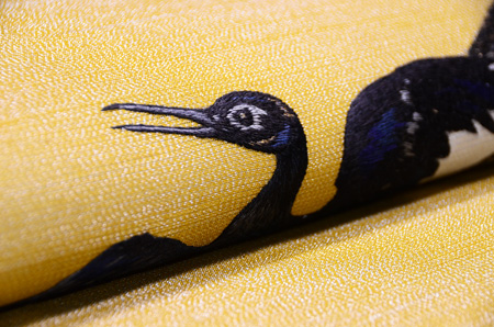 鵜を思い浮かべると漆黒のイメージですが、こちらの帯の鵜は黒をベースに濃紺、墨色、灰色など多色の絹糸を巧みに使い、黒い鳥という鵜を表情豊かに立体的に刺繍で表しています。