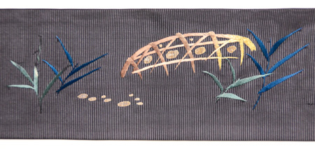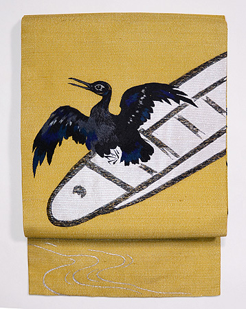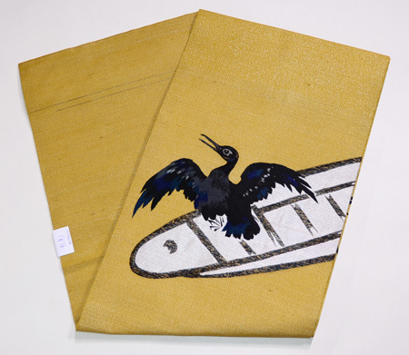 銀糸が織り込まれた辛子色の地に船と鵜が刺繍された洒落た名古屋帯です。