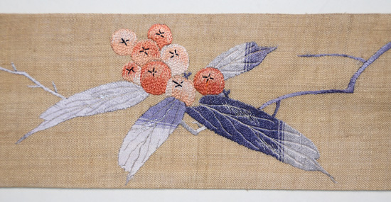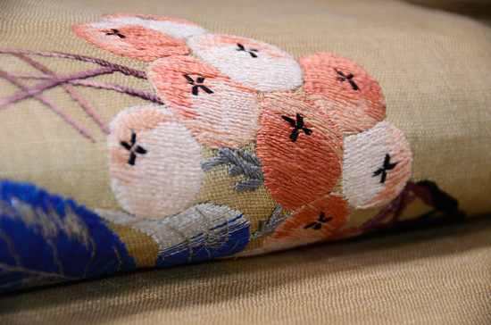 繊細な手刺繍ならではの絹糸の光沢感が美しい図柄、夏らしい文様で涼感をもたらします。