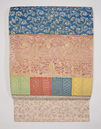 多色糸を用いて、相良刺繍と抜き地引きとを使い、巧みな刺繍帯になっています。