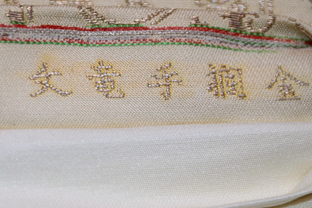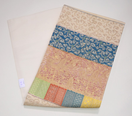 品の良い生成り地に唐草と金襴の龍文が、横段に織られた開き名古屋帯。