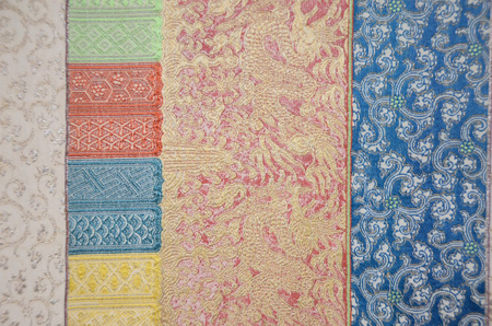 亀甲、青海波、菱文、鞘形と吉祥文が、細かく織りこまれた縞になり、美しい彩りのアクセントになっています。