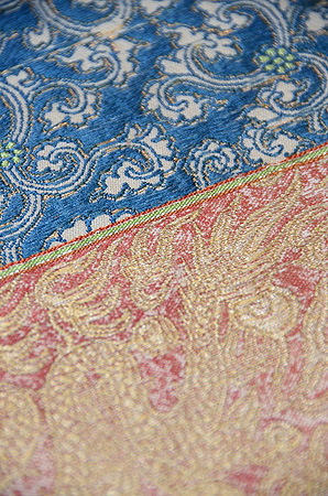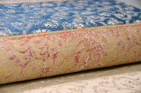 他にも、緑、青、小豆色、と、龍村カラーが色濃く出されていて、ダイナミックなデザインとともに、時代を経てますますの輝きを放っています。
