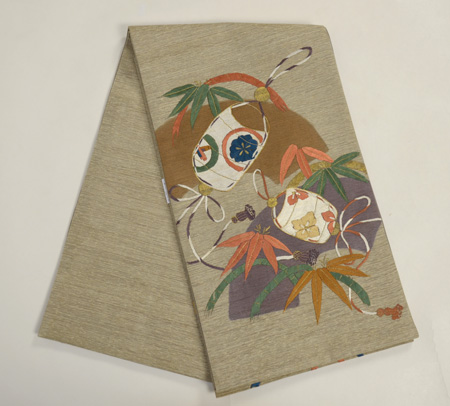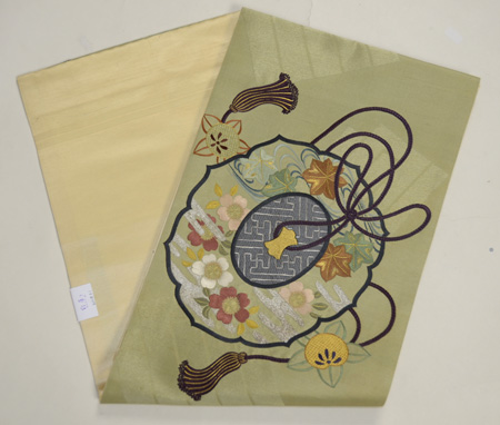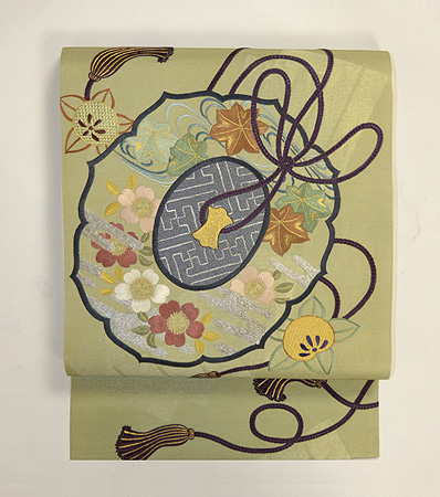 抑えめの色合いで大きめに印籠が刺繍されて、洒落気のある袋帯です。