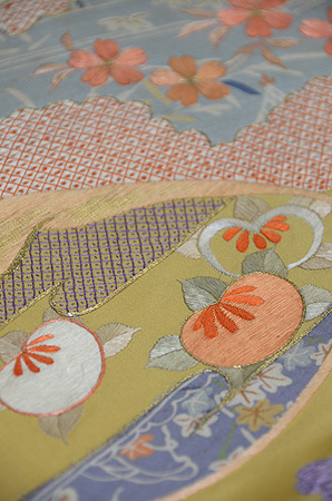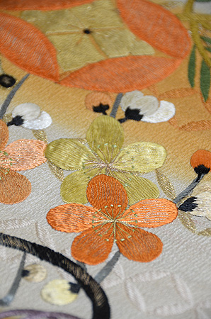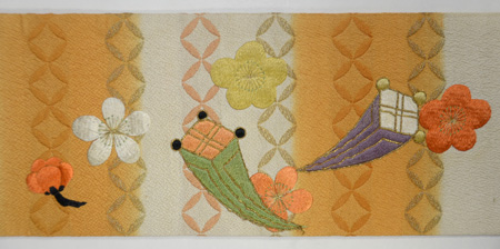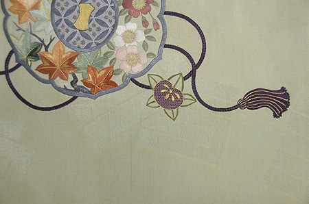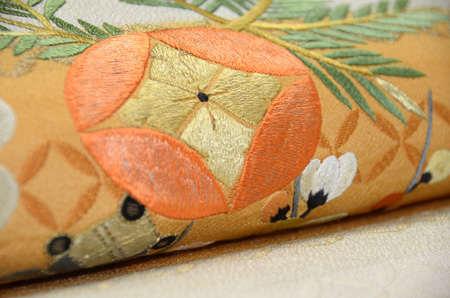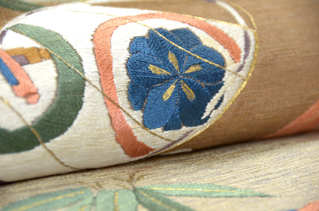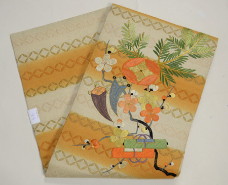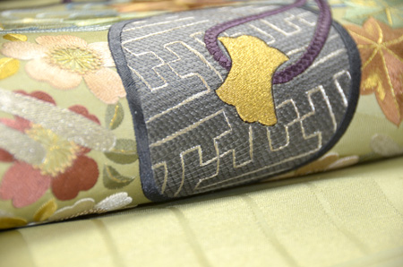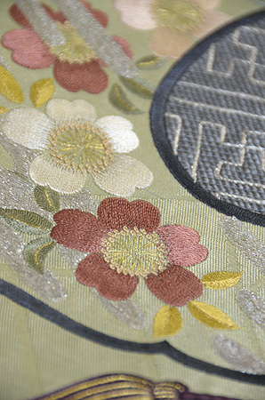 ふくれ織の地には七宝が織りだされ、梅、松、宝珠、巻物の刺繍と、とてもお目出度い文様です。