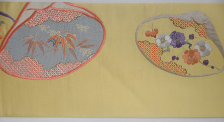 絡まる紐から美しい貝桶が連想され、金色に輝く地色と相待って雅な帯になっています。