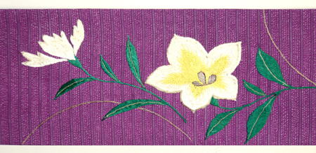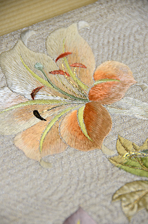 大輪の百合が撚りのない太い刺繍糸で施されています。
