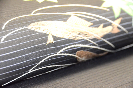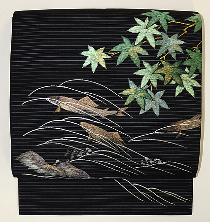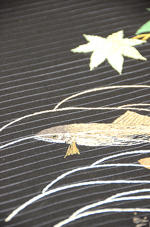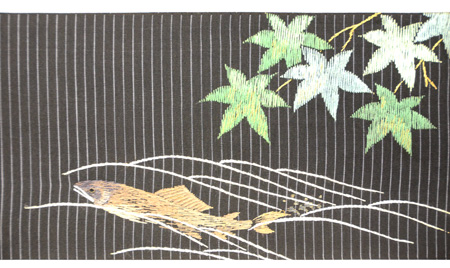 刺繍で表された川の流れの中を、鮎の群れが上流めざして泳いでいます。