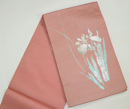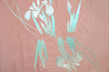 珊瑚色の絽綴れ地にやさしい燕子花の刺繍を施しています。
