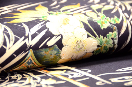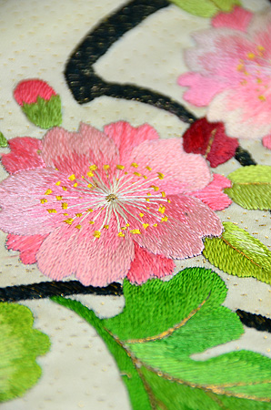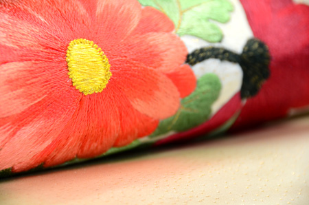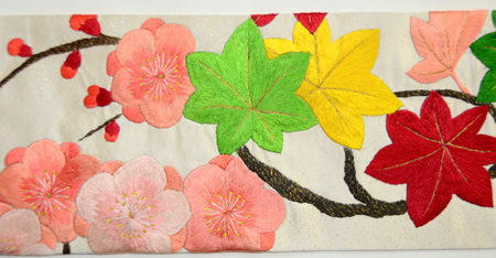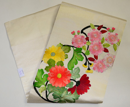 季節の花の丸文が、華やかな色合いで豪華に刺繍されています。