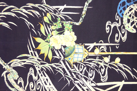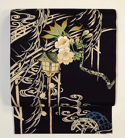 枝垂れる柳の橋の途中、見上げると数輪の桜。春の夜路を思わせる幻想的な構図の粋な帯です。