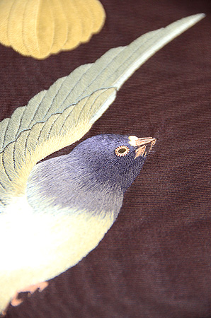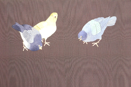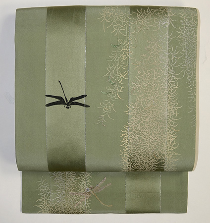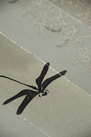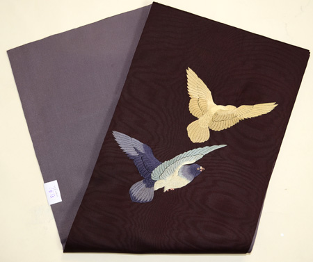 鳩の刺繍の技術が冴え、美しいモアレ模様との緊張感が見事な帯。