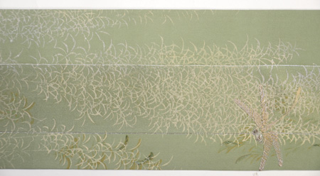 そのコプト裂中の傑作と言われる「花環をもつ鸚哥」の文様をもとに綴織の織技で復元したのがこの帯。