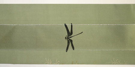 初夏の頃でしょうか、しだれ柳の葉に陽光が光り、蜻蛉が軽やかに飛んでいます。