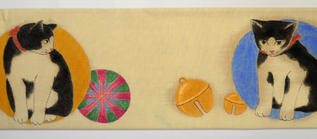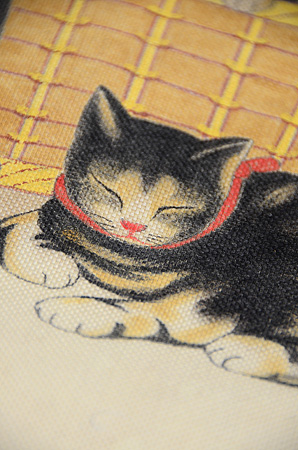 スウェーデン刺繍の布地に、子猫がこれでもかと言わんばかりに描かれています。