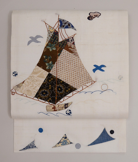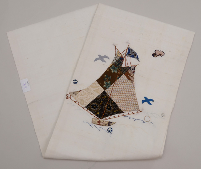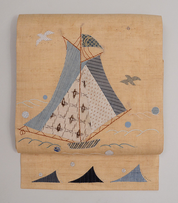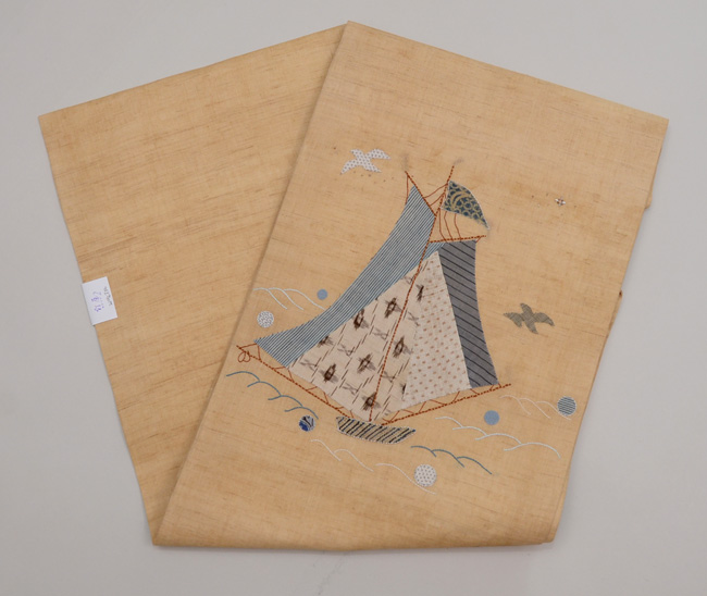 古い麻布をパッチワークのように繋ぎ合わせ、名古屋帯にしました。