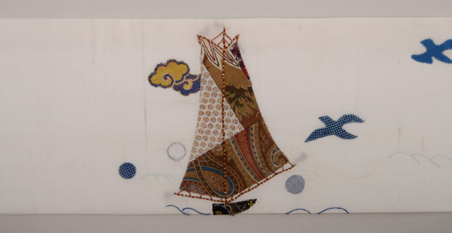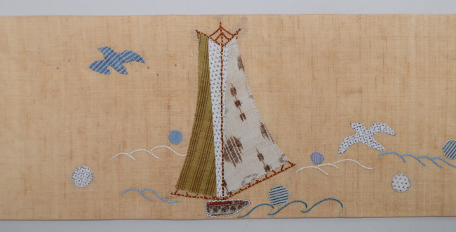 春の色を波とカモメ、ヨットの色を秋のイメージで創ってみましたが、テーマが帆走するヨットなので、夏にもありかとも思います。