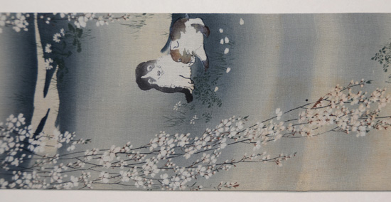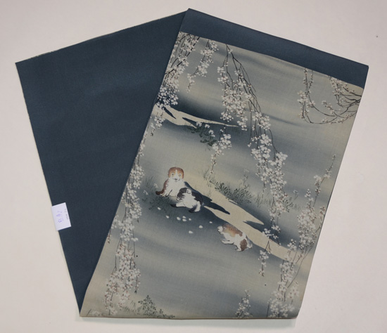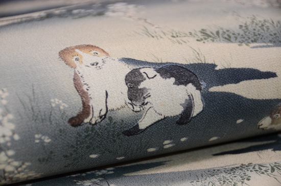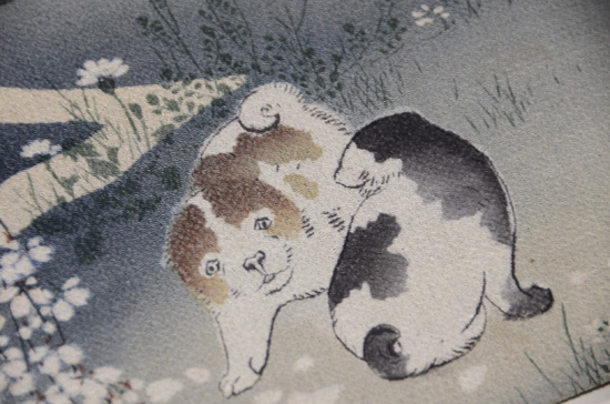 縮緬地しだれ桜に遊ぶむく犬の名古屋帯