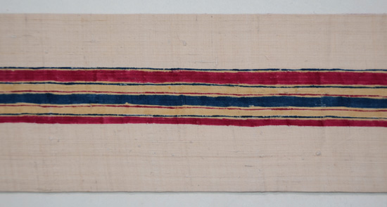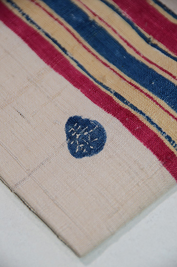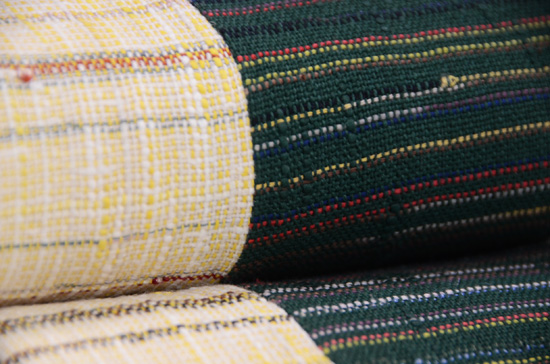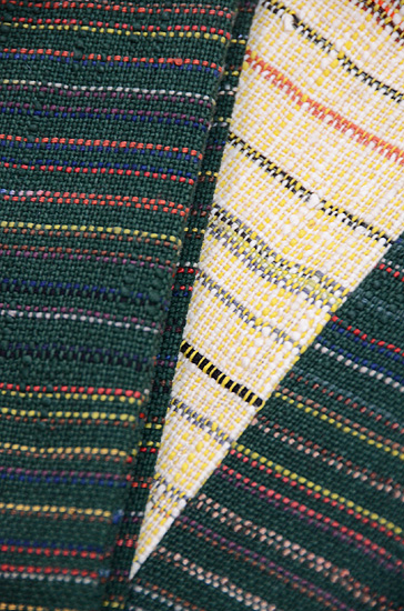白と黄色の縦糸に、同じく白と黄色を基調としつつ赤や緑、黒、水色など多色の横糸を織り込んだ