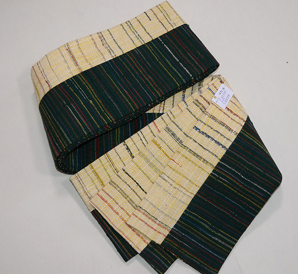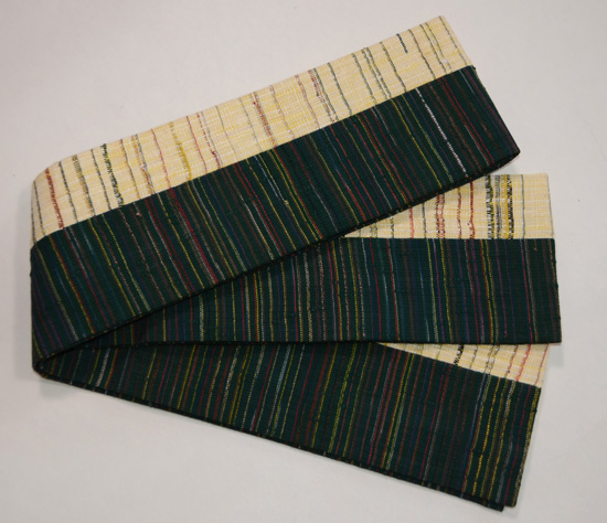 浦野理一さんの織り地を用いて、アイボリーと深緑のツートンカラーが楽しめるよう当店にて仕立てた半幅帯です。