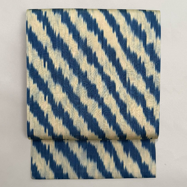 白地に明るいブルーの縞が斜めに入って、絣足がきれいに流れています。