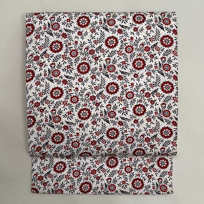 きれいな白地に、抜けるようにきれいな小花を散らした更紗文の名古屋帯です。