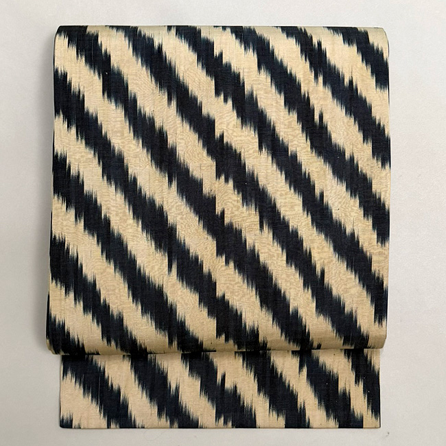 硬柔拮抗してデザイン化され縮緬に染められた、昭和初期の帯のようです。