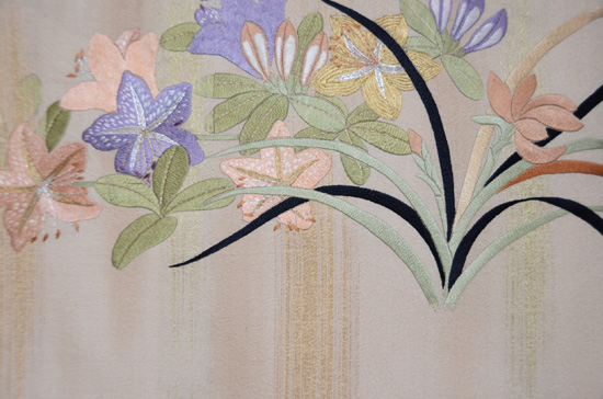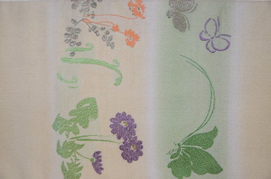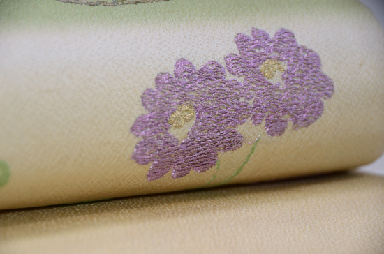 前柄には、霞む遠山も美しく、地色にマッチした刺繍の色合いに、清潔感が感じられます。